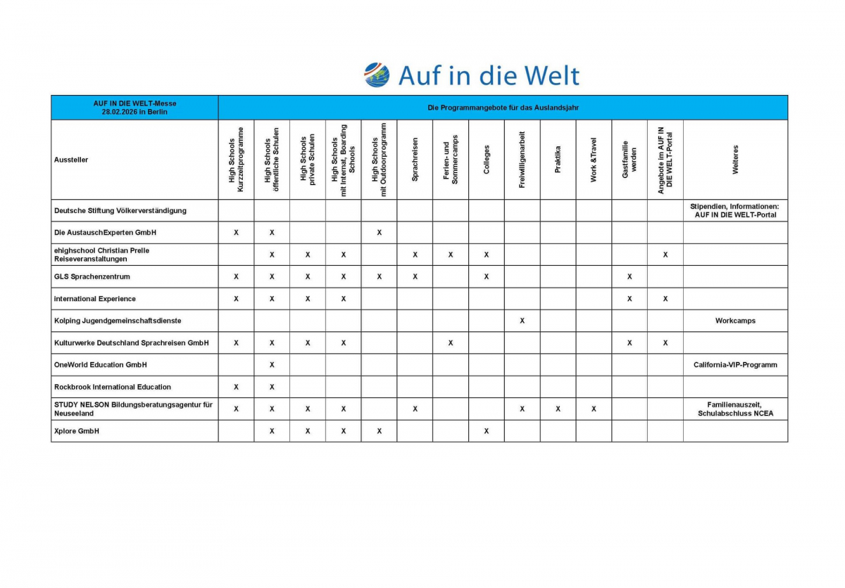 On February 28, 2026, from 10:00 a.m. to 4:00 p.m., visitors will have the opportunity to obtain information on a wide variety of topics, including exchange programs, high schools, boarding schools, private schools, gap year opportunities, language study trips, au pair and demi pair stays, voluntary services, internships, work & travel, and study abroad programs.